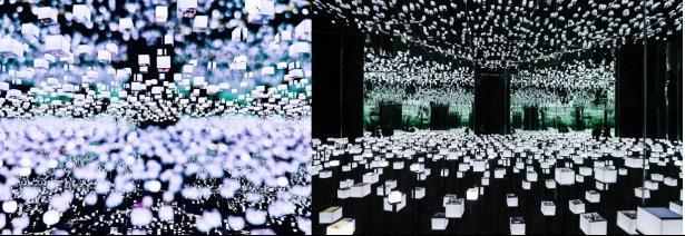 不同于teamLab注重极致光影美学的星空展,vivo的这片璀璨星空在空间美学构造上融入了手机影像的创意和元素。策展人从2021vivoVISION+手机摄影大赛中挑选出众多优秀作品,并且将它们特意打印在大小不一的白色方形灯表面,点亮后的方灯将影像画面映照在暗黑空间的镜子中,星火流动,光影交错,带给人震撼之余,却又有细腻的情感在内心升腾萦绕。