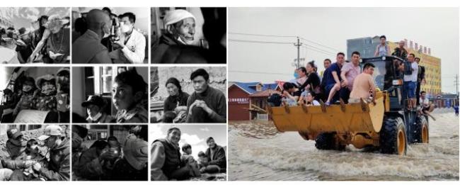 “成长”章节的展出作品 左:《高原上的义诊》 右:《洪水时期的公交车》