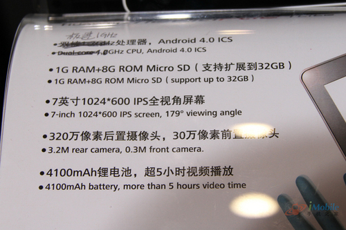 华为MediaPad 7Lite搭载主频为1GHz的双核处理器,比较耐人寻味的是这款平板之前在网络上的数据称其搭载1.2GHz双核处理器,今天在展台上,MediaPad 7 Lite的介绍版上本来写着1.2GHz处理器,后又被人用笔划掉,改写为了极速1GHz处理器。