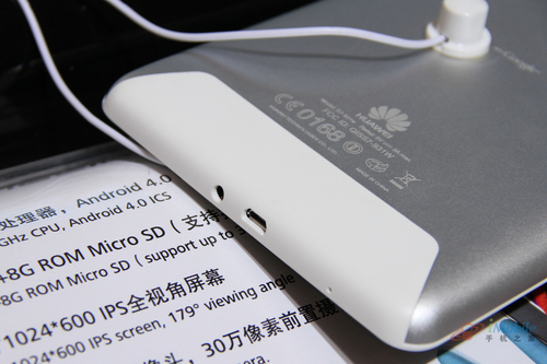 华为MediaPad 7Lite采用金属一体成型机身设计,除去顶部和底部的白色部分,其余背部及侧边的部分都由银色金属材质覆盖,手感不错。屏幕采用了一块7英寸的IPS屏幕,分辨率为1024*600像素,在介绍上还写着这块屏幕的可视角度可达179度。