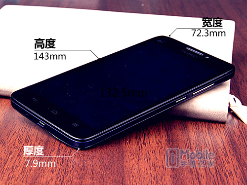 华为G620的三围是 143mmx72.3mmx7.9mm,外观设计十分简洁,正上方设置了听筒,听筒右侧是一枚前置摄像头,听筒正下方有显眼的华为标识,左上角标有移动4G的标识。