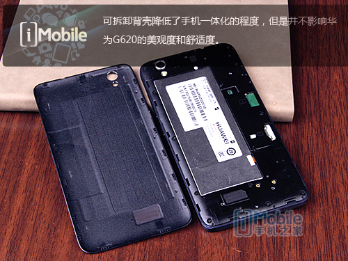 华为G620采用了可拆卸背壳,SD卡和SIM卡隐藏在背壳后