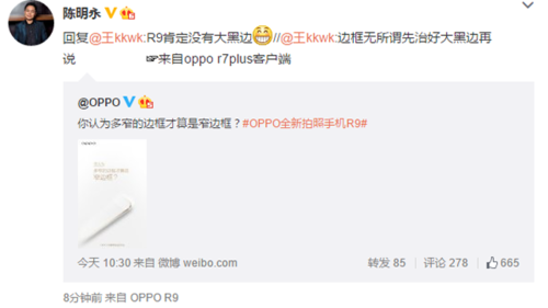 OPPO CEO陈明永还在微博上表示,R9肯定没有大黑边。也就是说不仅仅是窄边框,而且没有黑边。根据OPPO在微博上自曝的渲染图来看,边框的确非常窄,黑边的部分也控制在极小的区域内。