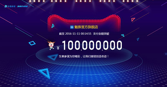 天猫双11刚拉开帷幕,魅族天猫旗舰店仅用时14分55秒销售额便突破1亿元。