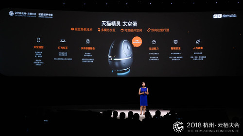 第二款产品是天猫精灵太空蛋,而其背后依据的就是刚刚介绍的AliGenie3.0。不同于天猫精灵的陪伴型,天猫精灵太空蛋是一款服务型机器人,除了有视觉导航技术外,还有多模态交互能力、可变舱体空间以及双向往复的进行能力,甚至加上了手势交互。