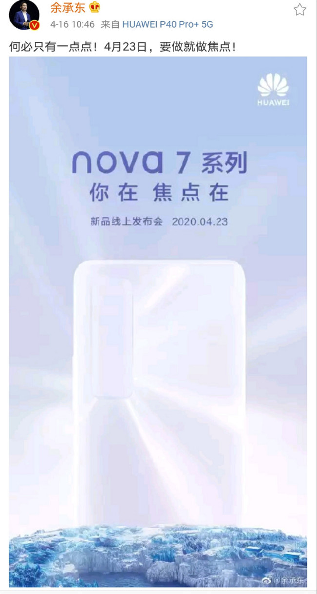 一周后的4月23日,nova7将于线上发布,这款产品将为我们带来哪些惊喜,华为又将掏出什么黑科技?让我们拭目以待!