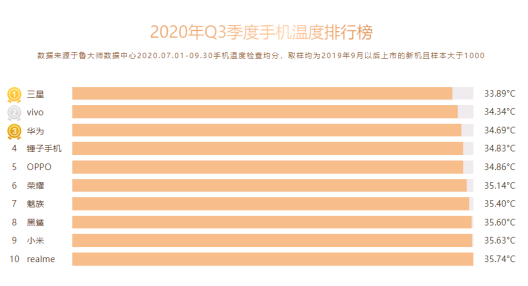 近期,鲁大师Q3季度报告公布了手机温度榜,其中包括了手机品牌日均低温榜、手机满载低温、手机日常低温榜和日均高温排行、峰值高温排行等榜单情况。在本次手机品牌日均低温榜中,三星以33.89的优秀成绩获得了本次的冠军。三星能有如此好的成绩在于三星品牌对手机散热技术的格外关注。