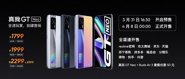 3月31日中午,realme举行新品发布会,正式带来新机realme 真我GT Neo,作为真我GT系列的第2款亮相机型,搭载天玑1200 5G SoC的realme 真我 GT Neo也是延续了高性能、高配置、高性价比路线,起步版本6GB+128GB定价1799元,8GB+128GB版本售价1999元,12GB+256GB版本售价2299元。