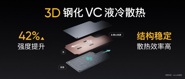 为了保证强性能的持续输出,realme 真我GT Neo还配备了3D钢化液冷散热,钢化VC液冷面积高达3175mm²,钢铜复合结构内部强度更高,有利于热量更快导出。同时realme 真我GT Neo还内置了4500mAh大电池并添加了50W闪充支持,仅需16分钟即可充电至50%,提供用户畅玩无忧的续航体验。