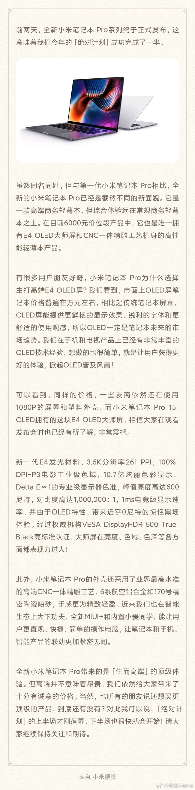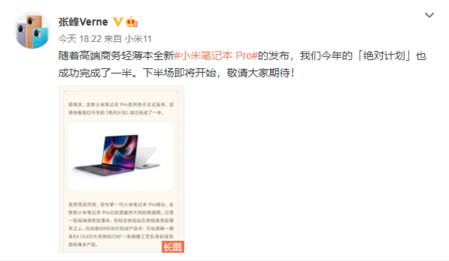 日前,小米集团合伙人张峰Verne微博发文称“随着高端商务轻薄本全新小米笔记本 Pro的发布,我们今年的「绝对计划」也成功完成了一半。下半场即将开始,敬请大家期待!”,在微博附图中张峰也再次表示还会有更顶级的产品,明显是在表示之后笔记本方面还会有更重磅的产品会继续登场。