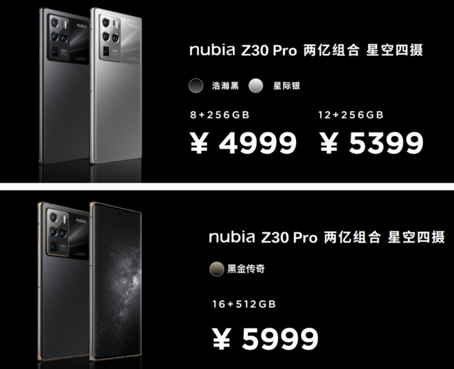 努比亚Z30 Pro浩瀚黑、星际银两款配色8GB+256GB售价4999元,12GB+256GB售价5399元,黑金传奇16GB+512GB版本售价5999元!新机已于5月20日16点在努比亚官网、京东、天猫、苏宁等各大渠道开启预约,5月25日早上10点正式开启首销。首销当天购买还可享受12期免息,欢迎通过努比亚线上线下售卖渠道,来购买这款诚意满满的旗舰之作!
