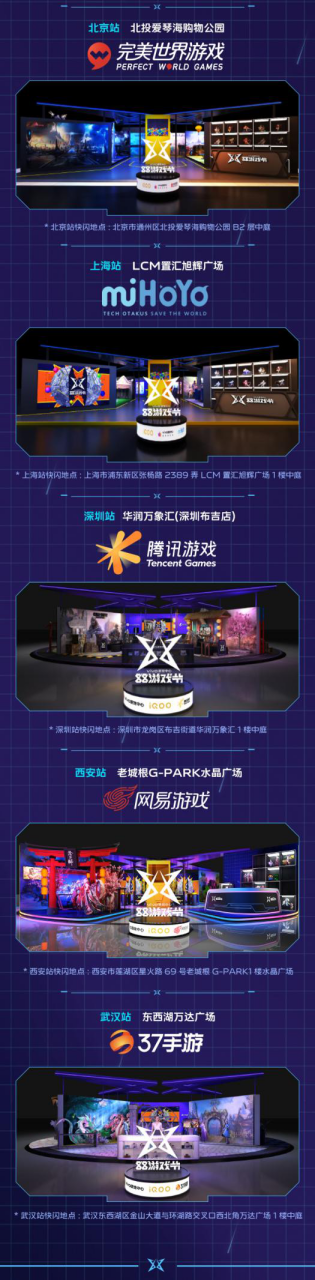 而这五个城市的快闪店,分别是:北京站,北投爱琴海购物公园(完美世界游戏);上海站,LCM置汇旭辉广场(米哈游);深圳站,华润万象汇 · 深圳布吉店(腾讯游戏);西安站,老城根G-PARK水晶广场(网易游戏);武汉站,东西湖万达广场(37手游)。有你所在城市的快闪店吗,是战友的,听到游戏集结号吹响就是时候了。