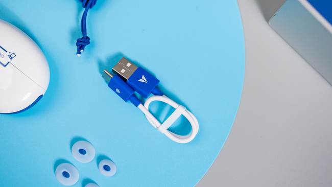 收纳包内层绒布包内是数据线和额外两套不同尺寸的耳帽,耳帽与数据线也同样采用了蓝白配色,其中数据线上还印有很有基德特色的滑翔翼和钻石元素。