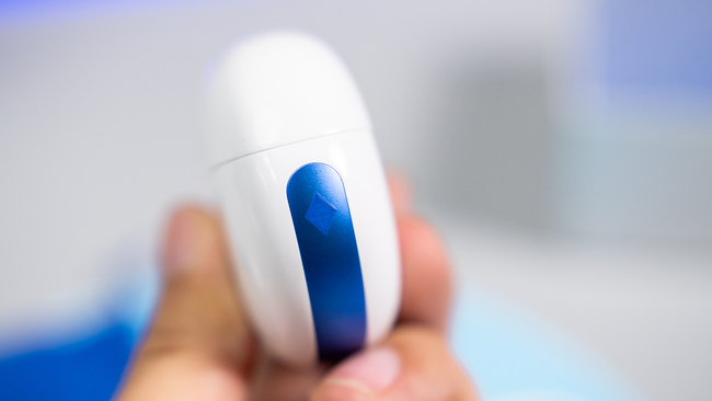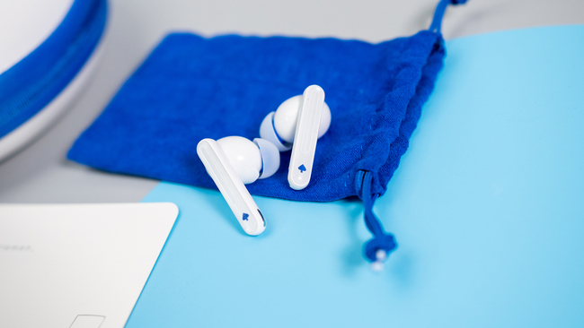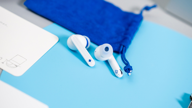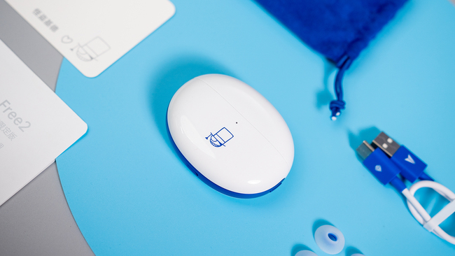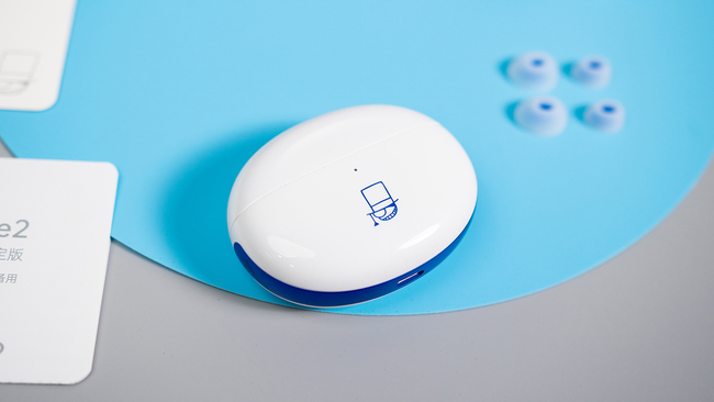 接下来我们可以注意力放回到耳机本身了。充电盒整体是扁平鹅卵石造型,开盖位置有浅浅的弧形小凹痕,避免了打滑也不容易藏污纳垢,白色主色调点缀蓝色腰线和字母图案,让整体看起来亮眼又有质感,本身颜值就已经相当能打了,再加上还有丰富定制元素的加持。