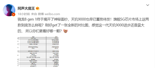 12月的第一天,高通发布了骁龙8 gen 1,把今年的旗舰手机芯片之争推上了高潮。加上不久前官宣的天玑9000,明年旗舰芯片摆到了台面上。近期有数码大V表示:“骁龙8 gen 1终于揭开了神秘面纱,天玑9000也早已蓄势待发!旗舰5G芯片市场上这两款到底怎么样呢?刚好get了一张全新的对比图,感觉这一代天玑9000进步还是蛮大的,所以你们更看好哪一颗?”