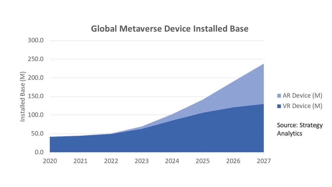 “到目前为止,市场主要是VR头显设备,AR设备主要局限于企业市场。然而,随着更多面向消费者的设备发布,我们预计AR头显设备将推动未来的增长。2021年,AR设备出货量仅占元宇宙设备的1%多一点,而到2027年,其占比将增长到64%。”
