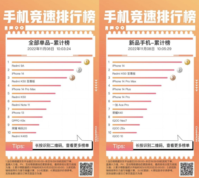 在单品销量方面,截至11月8日10点,全部单品及新品手机当日榜及累计榜中,iPhone 14、Redmi K50至尊版等在榜上,喜欢iPhone产品、想要体验优质摄影与使用体验的消费者,都可以在京东11.11下单购买,以实惠价格将产品带回家。此外,Redmi K50、iPhone 13、一加Ace Pro、iQOO Neo7等产品都是受到消费者青睐的优质选择,消费根据自己的预算和需求选择即可。